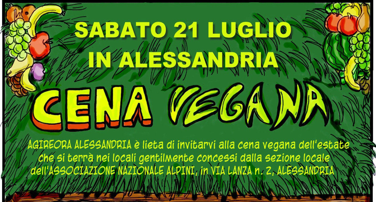 Siamo lieti di invitarvi sabato 21 luglio alla Cena vegan per l'estate che si terrà nei locali gentilmente concessi dalla sezione locale dell'Associazione Nazionale Alpini, Via Vescovado 2, Alessandria